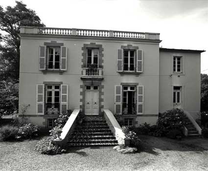 Maison enduite à plan double en profondeur, à élévation ordonnancée à trois travées surmontée d'un toit terrasse. Au sud, du fait du décalage du terrain, le niveau de soubassement correspond à un rez-de-chaussée, surmonté de deux étages carrés. Distribution classique avec couloir axial distribuant quatre pièces, et un escalier dans oeuvre, en charpente, tournant à retours avec jour. Communs en moellon de granite à comble à surcroît. Puits en moellon