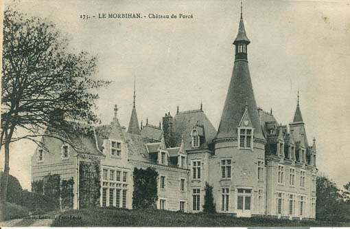 Le Chateau de Porcé se situe à l'Est du bourg d'Arradon dans le Morbihan. Chateau attesté en 1443 appartenant à Jehan Sigalo, demeurant en son hostel de Kervoyer. Chapelle datant peut-être du XVIIIe siècle, détruite puis reconstruite en 1911. Château édifié en 1885 pour le marquis de La Révellière, s'appuyant sur le manoir antérieur, détruit par les allemands en 1944. Ferme et colombier datant de la fin du XIXe siècle. Colombier, chapelle et ferme conservés. Château en moellon enduit, ouvertures en calcaire, à un étage carré et deux étages de comble, toit à longs pans à pignon découvert, noue, croupes, toit conique sur les tours.