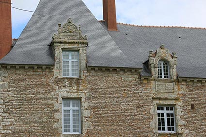 "Situé à l'orée du bois du Talhouët, le domaine du même nom se compose d'un grand logis entouré de ses dépendances (grange, étables, fournil), d'une citerne à eau, d'une chapelle et de sa sacristie, d'anciens murs de clôtures et de jardins avec bassin.Le château orienté nord-sud, forme un plan en L. La partie centrale avec son décrochement est la partie la plus ancienne. L'élévation nord conserve une porte surmontée d'un blason (représentant les armes des familles Du Bot et Briande de la Chapelle (?) tenu par deux lions ou guépards en haut-relief. Cette élévation comporte également deux oculi en rez-de-chaussée qui éclairent le départ d'escalier menant à une cave, ainsi qu'une lucarne datée 1582. Sur l'élévation sud, la porte principale est mise en valeur par des pilastres surmontés d'un fronton triangulaire. Au dessus, l'inscription : " ALAIN DU BOT BRIANDE DE LA CHAPELLE HANRI DU BOT" confirme l'identité des commanditaires. La lucarne voisine porte quant à elle, la devise du couple : "ce qui me plaist, m'ennuie", encadrée des initiales de leurs prénoms, A et B. Dans le pignon est, des pierres d'attente et quelques ouvertures bouchées témoignent du projet d'extension d'un pavillon identique à celui de l'ouest, projet non réalisé. L'élévation ouest de l'extension ouest, plus basse, montre plusieurs ouvertures bouchées.A l'intérieur, l'étage est distribué par un escalier à retours à volées droites sur mur noyau.La chapelle Saint-Jean est de style Renaissance. Elle est à vaisseau unique et présente un chevet à pans coupés. Le mur-pignon occidental est surmonté d'un clocheton à dôme. La nef est couverte d'un lambris en berceau et en cul-de-four dans l'abside. L'ensemble est lambrissé et entièrement quadrillé par des tiges de bois. La clé de la voûte porte les armoiries des familles de Rohan, du Talhouët, du Bot, et Huchet. Deux blasons n'ont pas été identifiés. Trois baies éclairent la nef et deux niches sacraires sont percées dans les murs est. Il faut également noter la présence d'un bénitier ancien, encastré dans le mur méridional, ainsi que deux confessionnaux (18e siècle?). Au nord-ouest du logis s'étend une dépendance à plan en U dont la partie sud est à usage d'écuries et de remise ; en moellon de schiste, sans étage, elle est ouverte d'une grande porte charretière axiale. Au sud de cette remise se trouve une citerne circulaire en moellon qui émerge du sol d'environ 1m.A l'est du château dans l'ancien jardin, le bassin circulaire est bordé de granite.